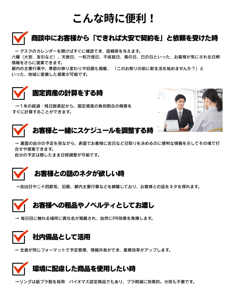 • 表面:お客様と一緒に日取りを決める用途に最適