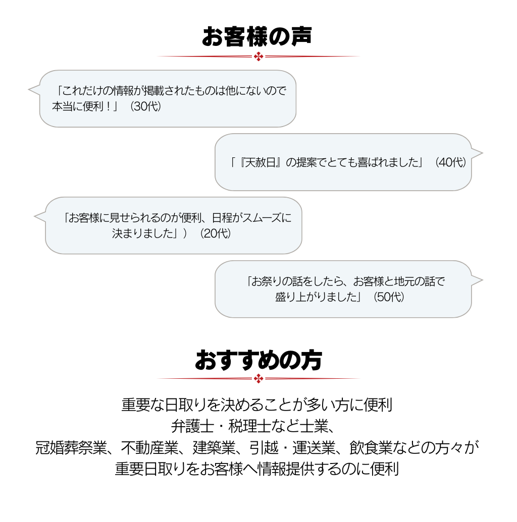 • 六曜・天赦日・一粒万倍日・不成就日など、重要な吉凶日情報を網羅