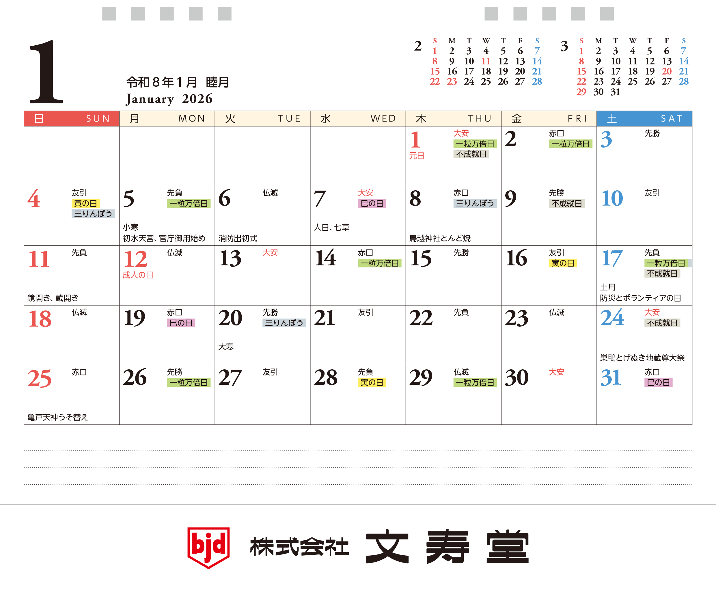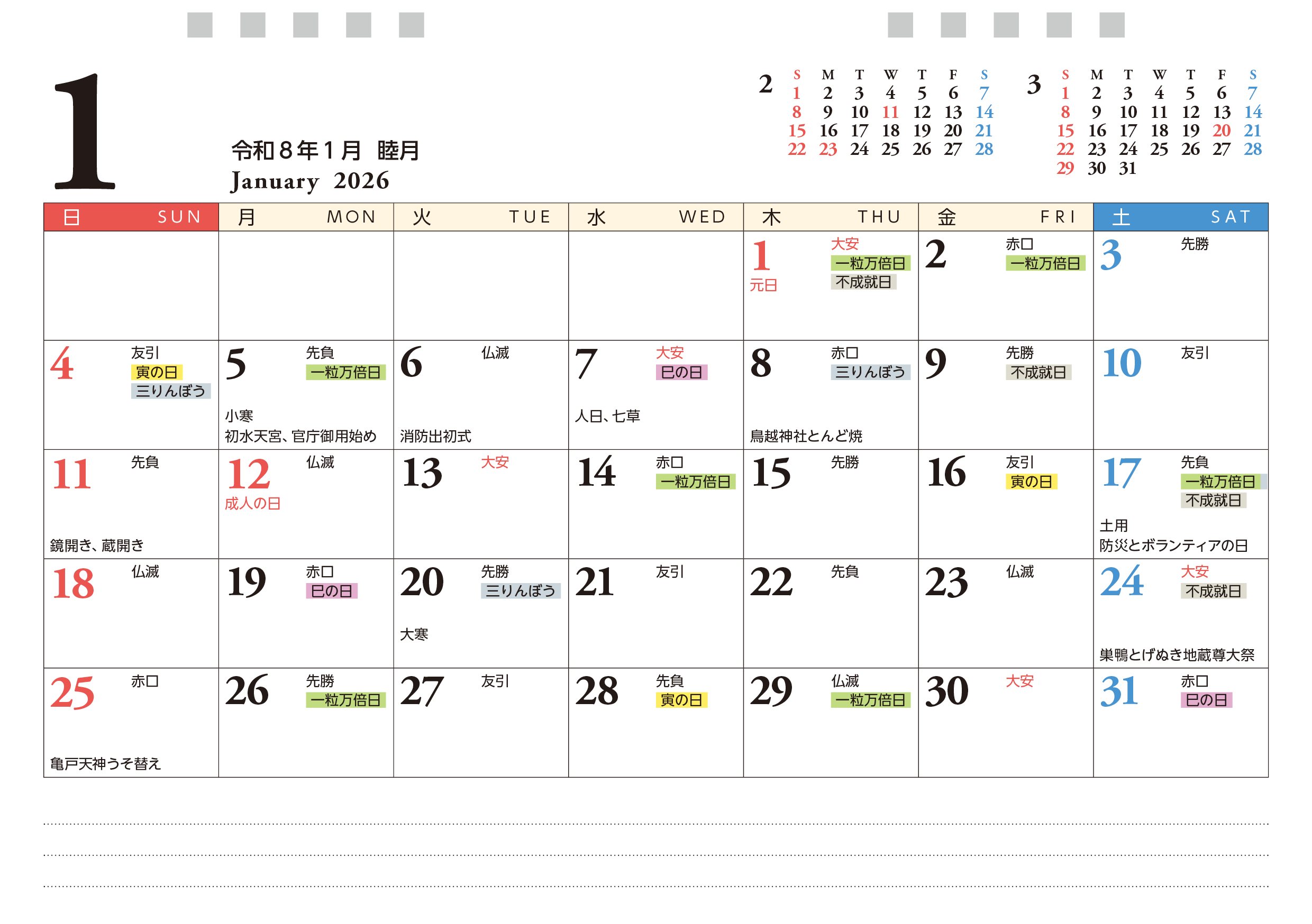 掲載内容 六曜、天赦日、一粒万倍日、不成就日、寅・巳・甲子の日、二十四節気